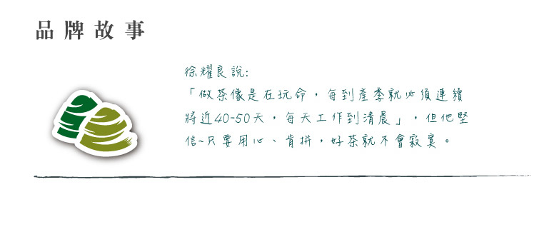 徐耀良先生不求量、不求快,遵循祖父製茶口訣「頭水、二香、三外觀」 ,注重每個細節,追求的是提供給消費者「好入喉、有質感、高品質」的茶。