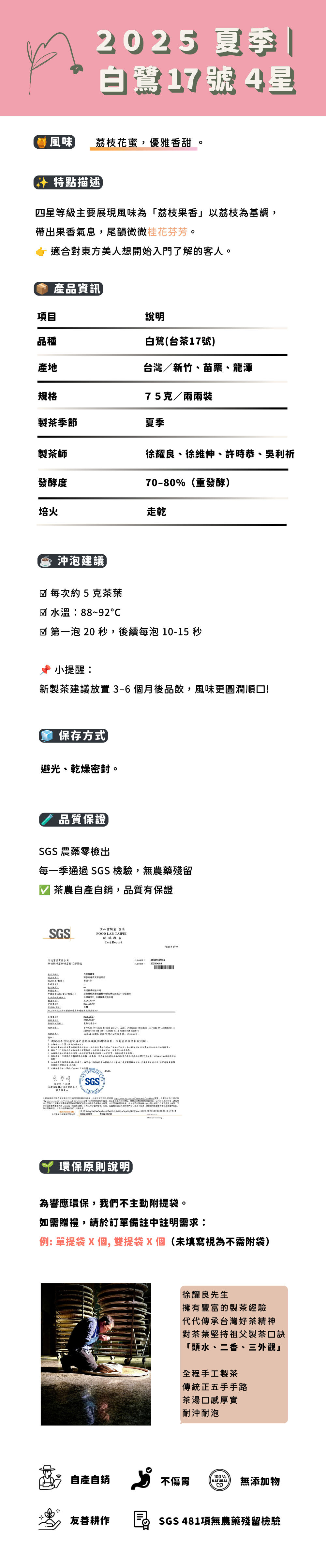 描述:小綠葉蟬吻過的葉片散發飽滿的水果香氣,本支茶品採用茶改場力推的「台茶17號/白鷺」製作,品種本身有富有獨特的花香,形成一支既有桂花調亦有水果香甜韻的獨特作品。